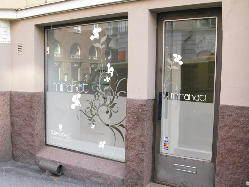 Kampaamo Mirakati 2009. Logo, graafinen ilme, käyntikortit, ikkunateipit, verkkosivu.