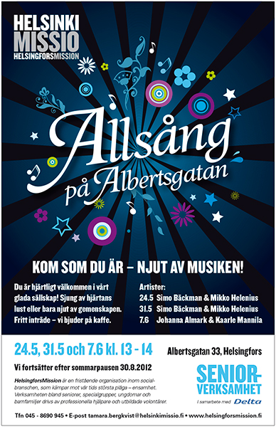 HelsinkiMission Allsång på Albertsgatan -lauluillan visuaalinen ilme. Tässä sanomalehti-ilmoitus.
