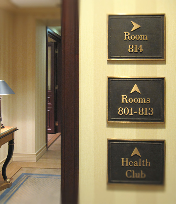 Hotel Kämp, sisätilojen pronssiset opasteet ja huonekyltit 1999.